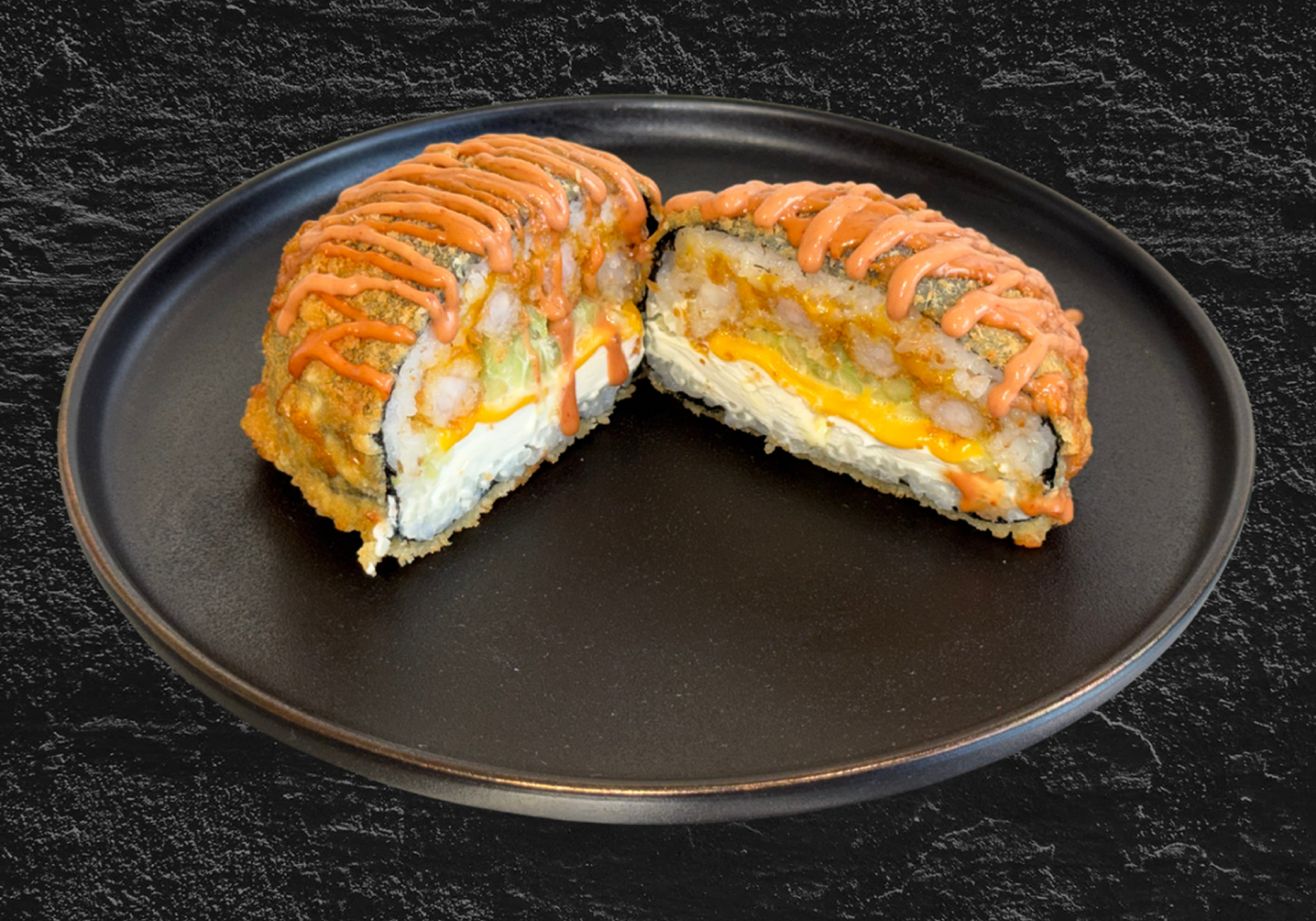 Compoziție: orez, cașcaval, cheddar, creveți tempura, castraveți, sos spicy. Masa: 450g