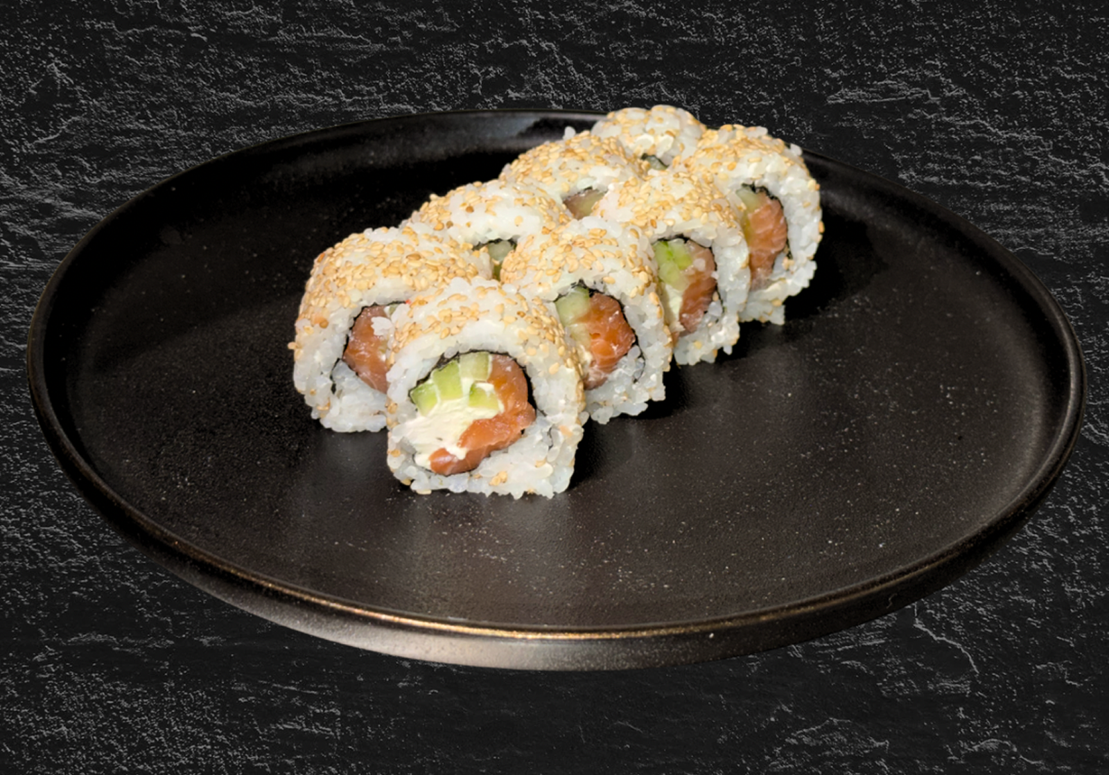 Conținut: orez, cremă de brânză, castravete, somon, susan. Masa: 255g.