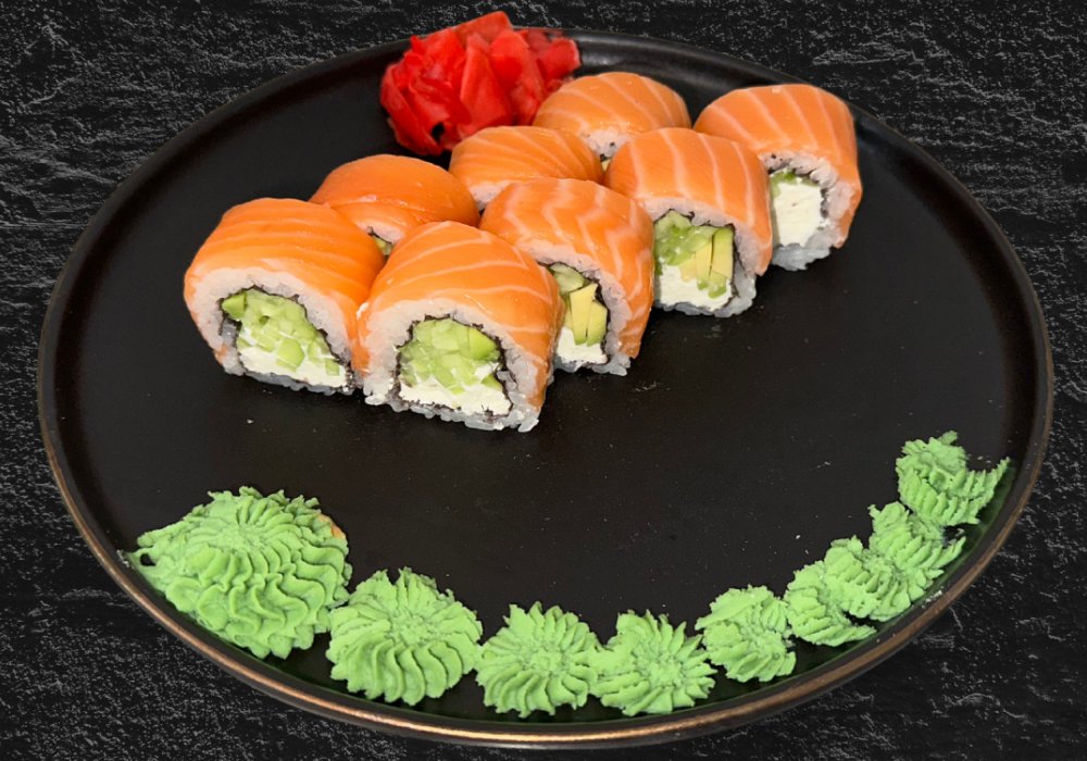 Somon , Orez , Cașcaval, Castravete, Avocado, Nori, Vasabi, Ghimbir, Soia. Masa: 300g