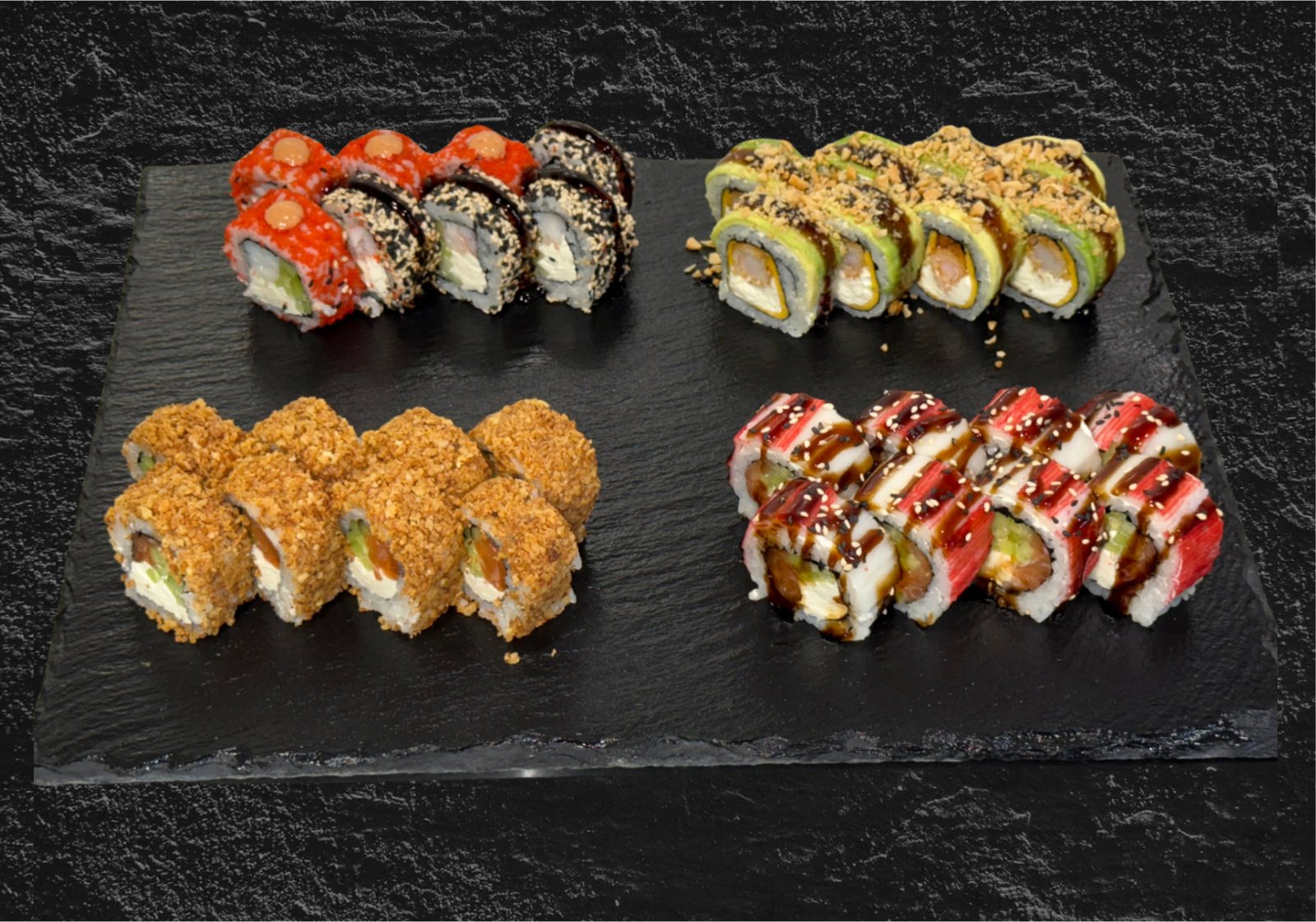 Avocado Roll, Surimi Roll, Otto roll, Bunito roll. Masa: 1220g.