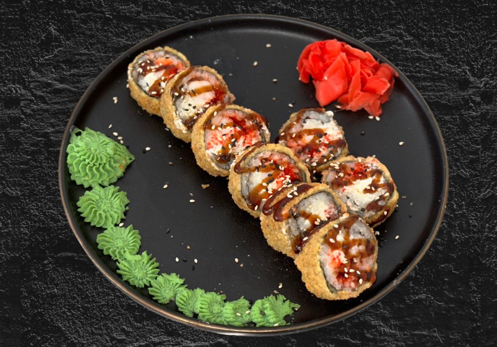 Sos unagi, Susan mix, Orez, Cașcaval, Masago, Crevete, Vasabi, Ghimbir, Soia. Masa: 300g.